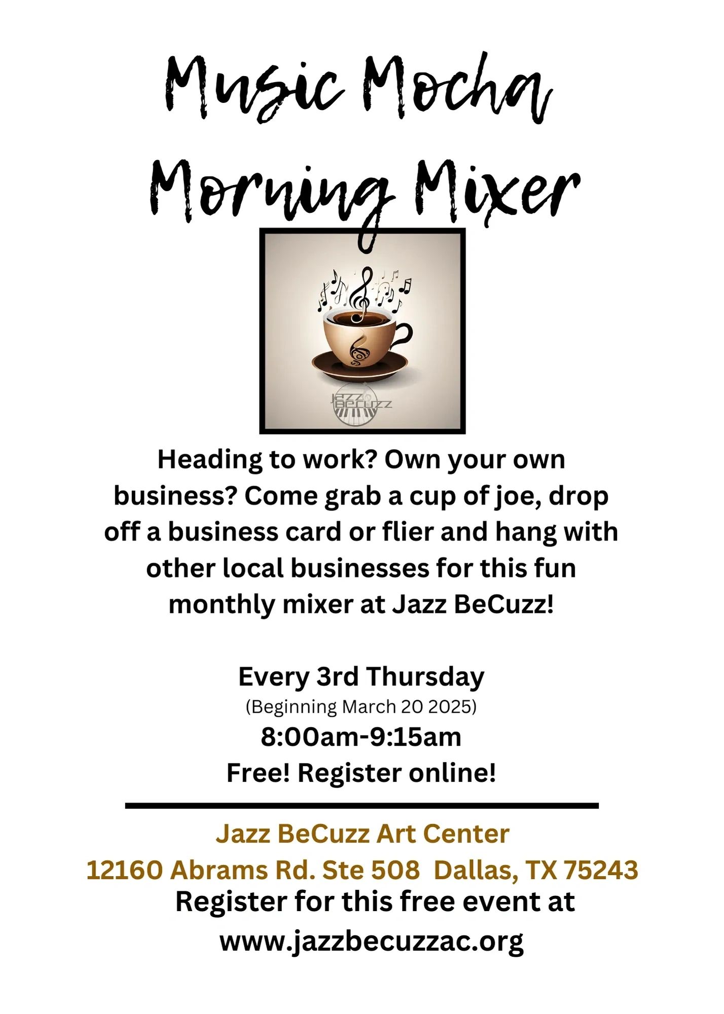 The Jazz BeCuzz Art Center was founded in 2014 by Candace Mahogany Miller (with the encouragement and support of Dallas Jazz Legend Jason Davis) as a safe and diverse space for families to enjoy fine and cultural arts while exploring contemporary ways to pioneer and create music, literature and movement. Candace, since the age of 11 began